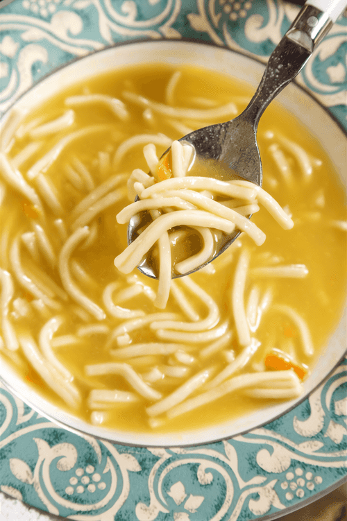 Thick chicken broth with noodles