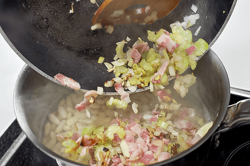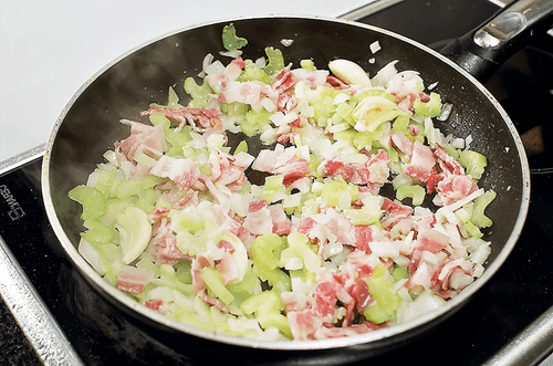 In a well-heated pan, fry the bacon cut into small cubes. Add chopped onion, leek, and celery and sauté until soft, then add crushed garlic and keep the vegetables on the heat for a couple more minutes.