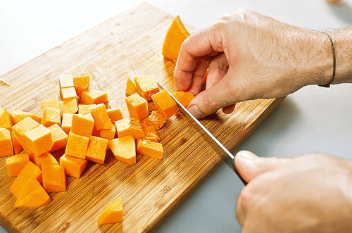 Peel the pumpkin and cut it into cubes. Similarly, cut the peeled carrots and potatoes (the amount of potatoes in the soup should equal the total amount of other vegetables). Add the vegetables to the pot with the beans.