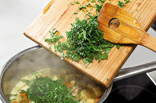 Chop the spinach and parsley and add them to the soup a few minutes before cooking is done, so the greens don't lose color. Cook for another five to seven minutes. Remove the bacon and parmesan skins, thyme sprigs, and bay leaf from the pot. Add salt.