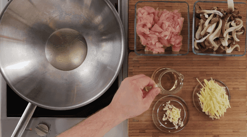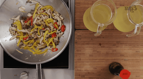 Heat the wok and add vegetable oil. In the hot oil, fry thinly sliced ginger, chicken, oyster mushrooms, and minced garlic. The result should be chicken and mushrooms ready to eat. The mushrooms should release juice, which must evaporate at high temperatures, and the oyster mushrooms should develop a nice brown crust, filling the kitchen with the aroma of freshly fried mushrooms.