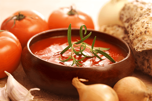 Extract the seeds from the remaining tomatoes and cut them into small cubes. Also, chop the cucumber and onion. Add everything to the soup. Season with salt and pepper and place in the refrigerator to chill.