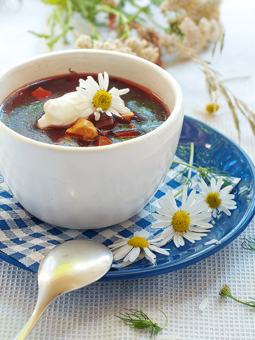 Baked beetroot borscht with Scottish herring