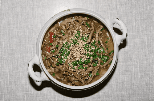 Heat the chicken broth. Boil the noodles in salted water until cooked, then drain. In a larger deep serving dish, first place the noodles, then the beef with mushrooms on top, add two spoons of chili sauce, and pour in the broth. Sprinkle with chopped green onions and sesame seeds on top.