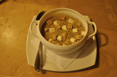 Then pour in the cream, bring to a boil again, and remove from heat. Serve with croutons - they can be added directly to the soup or eaten on the side.
