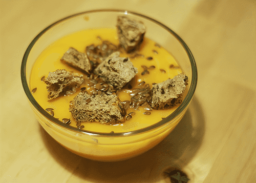 Sweet potato puree soup is a delicate and warming dish from Japanese cuisine, perfect for cozy evenings. Sweet potatoes naturally pair well with carrots and leeks, creating a rich, velvety flavor. Grated ginger adds spiciness while garlic deepens the aroma. Flaxseed oil and seeds enrich the soup with healthy fatty acids, making it not only tasty but also nutritious. Historically, such soups were part of the traditional Japanese diet known for its balance and naturalness. This puree soup is served with crispy garlic croutons that complement its texture. It is great for a light dinner or as part of a healthy diet, providing comfort and satisfaction without heaviness.