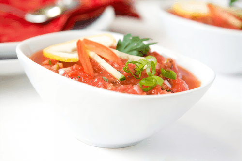 Dice one cucumber and one tomato and add them to the soup. Sprinkle with chopped greens.
