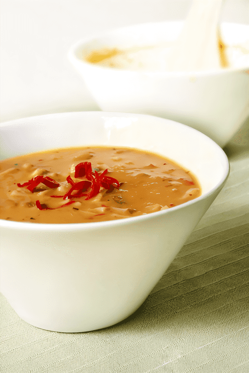 Boil the eggs hard, slice them, and mix with the soup. Pour into plates and garnish with hot chili.