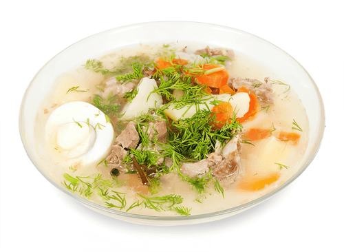 Beat the eggs with vinegar and pour into the soup, stirring continuously. Bring the soup to a boil and remove from heat.