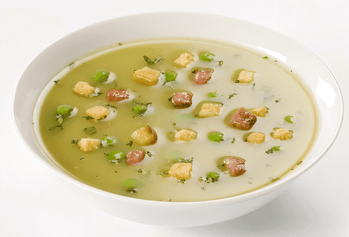 Pea soup with bacon and croutons