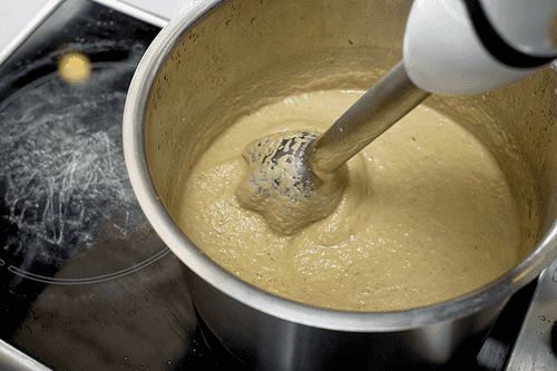 Remove the pot from the heat and use an immersion blender to turn its contents into puree. If desired, strain through a sieve for a lighter consistency. Add more water or broth if needed, and season with salt and pepper to taste.
