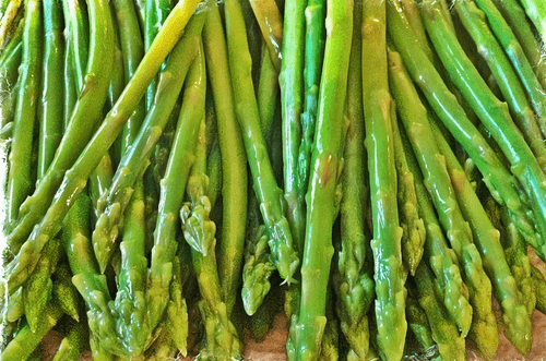 Sauté 8–10 asparagus stalks in olive oil for 2–3 minutes, then add 300 ml of chicken broth, bring to a boil and cook for 5 minutes.