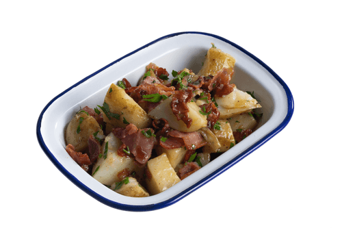 In vegetable (refined sunflower) oil, we fry the fat (the cut bacon) until it becomes cracklings. We remove the cracklings with a slotted spoon and add them to the broth.