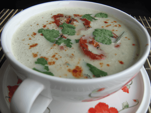 Add eggplants to the boiling broth, cook for a couple of minutes, add cream, and cook for 5 minutes. Blend the finished soup into a puree with a blender, return it to the heat, add nutmeg, minced garlic, salt to taste, and cook for a couple more minutes.