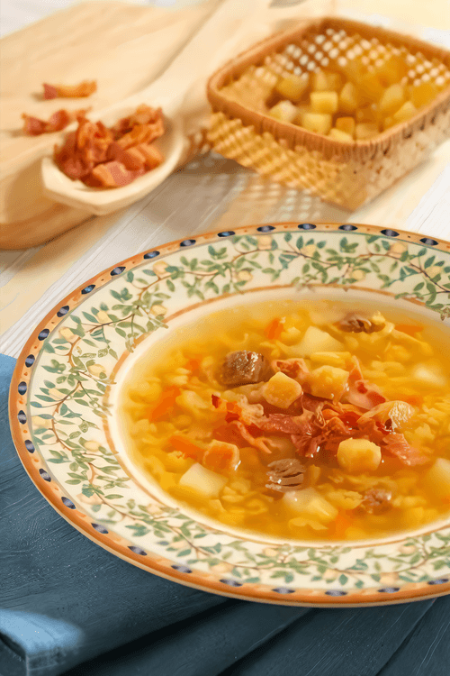 Pea soup with bacon and croutons is a true embodiment of coziness and home warmth. Originating from Russian cuisine, it combines simplicity and heartiness, making it an ideal choice for cold days. Tender peas simmering in aromatic beef broth reveal their soft flavor, while potatoes add thickness and richness to the soup. Crispy golden croutons provide a textural contrast, and fried bacon adds a pronounced smoky note. This dish is perfect for family dinners, filling the home with an appetizing aroma. Here simplicity meets depth of flavor, and traditional ingredients create a harmonious blend. Serve the soup hot, topped with croutons and bacon, and enjoy its cozy taste that warms the soul.