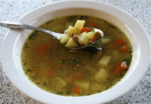 Canned tuna soup with green peas