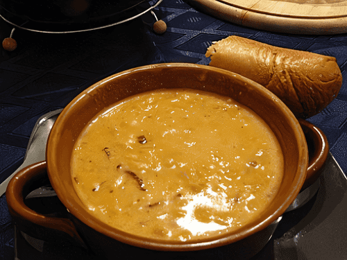 Grate the cheese on a coarse grater and add it to the soup. Season with salt and pepper. Bring to a boil, stirring until the cheese is completely dissolved, and remove from heat. Cut the bread into small squares and fry in butter. Slice the remaining onion into rings, coat the rings in flour, and fry in vegetable oil.