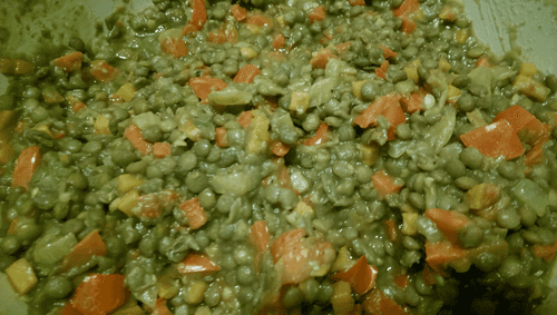 Heat a tablespoon of olive oil in a pan and fry the sweet pepper in it. After five minutes, add spices and fry, stirring, for another minute. Then add the remaining vegetables and three more tablespoons of oil and fry for another eight minutes. Mix the vegetables with the lentils.