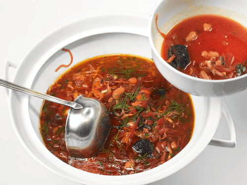 The fruity and at the same time slightly smoky taste of prunes goes well with any smoked meat and creates the outline of the recipe. The broth can be any: with chicken the soup will be lighter, and the taste more transparent. Beef and pork lead in the direction of brutality. You can take the classic dressing, from sour cream, or you can be a little creative and add baked garlic passed through soft goat cheese, which is then put in a plate on the surface of the soup in the form of a quenelles.