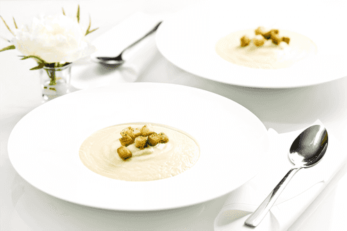 Cauliflower soup with croutons is a delicate and refined dish of Russian cuisine that combines lightness and richness of flavor. Historically, cauliflower was considered an aristocratic vegetable, and its creamy texture makes this soup particularly comforting and warming. During preparation, the cauliflower is caramelized with shallots, adding a subtle sweetness and depth of flavor to the soup. The velvety consistency is achieved through careful blending and the addition of hot vegetable broth. Aromatic crispy croutons made from brioche and fried parsley leaves add a contrast of textures, making each spoonful unforgettable. Ideal for cozy home evenings or as an elegant first course in a sophisticated menu.