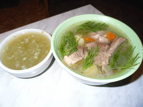 Chop the garlic and place it in a bowl, pour hot broth over it — this is the brine. The shulum can be garnished with greens if desired.