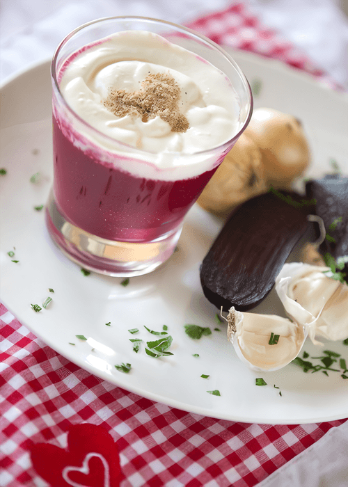 Beet cappuccino is a refined dish of European cuisine that combines the rich flavor of sweet beetroot, the creaminess of sour cream foam, and the crunchy notes of walnuts. This dish not only surprises with its presentation reminiscent of classic coffee cappuccino but also impresses with the depth of its flavor bouquet. Historically, beetroot has been widely used in European gastronomy due to its versatility and benefits. This cappuccino is an elegant and original treat that can be served as a sophisticated appetizer or light aperitif. Its rich color and airy texture make it perfect for special occasions. With a harmonious balance of sweetness, spiciness, and creamy texture, it leaves an unforgettable impression and awakens gastronomic curiosity.