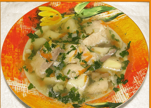 After it boils, add parsley, spices, salt, and pepper. Cook for another 5 minutes — the fish soup is ready.