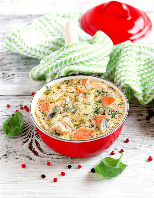 Cheese soup with trout and mushrooms