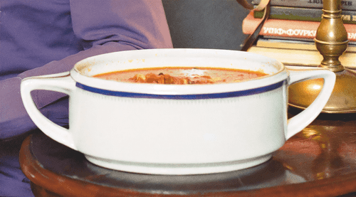 On the table for borscht, place bowls of sour cream and finely chopped garlic, fresh cucumber, sweet-sour apple, and of course herbs: dill, onion, parsley. So everyone can add what they want.