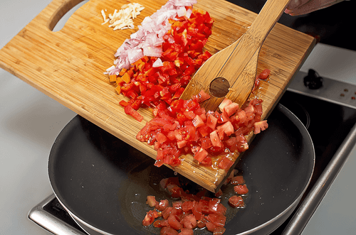 Blanch the tomatoes, peel them, and cut into cubes. Remove the seeds and membranes from the red pepper and also cut into cubes. Peel and chop the carrot, garlic, and onion. Heat a tablespoon of olive oil in a pan and sauté all the vegetables.