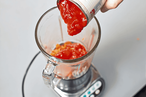 Transfer the roasted vegetables to a blender bowl, add the flesh of canned tomatoes, basil leaves, a bit of Tabasco, balsamic, salt, ground nutmeg, Italian herbs, ground black pepper, a glass of white wine, and half a chili pepper. Blend until smooth.