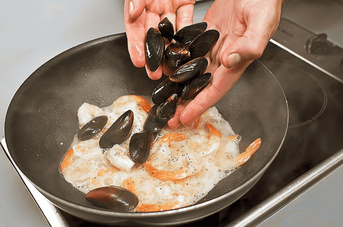 In the remaining tablespoon of olive oil, sauté the shrimp and mussels in a pan (remove and discard any unopened mussels). Lightly salt and add some Italian herbs for flavor.