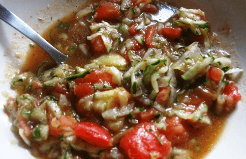 Sauce: oil, vinegar, salt, pepper, herbs, a little cold water. Pour in and mix everything.