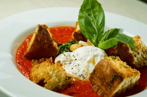 Tomato cream soup with Tuscan croutons and poached egg