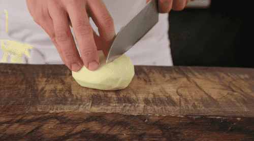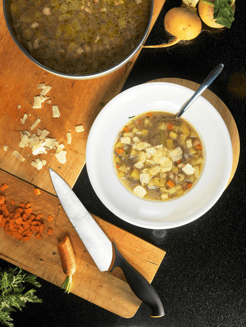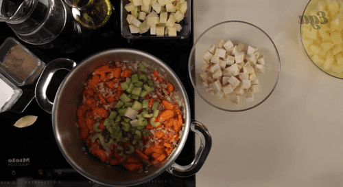 Cut the celery stalk and root, carrot, potato, and turnip into larger cubes. All root vegetables should, of course, be peeled.