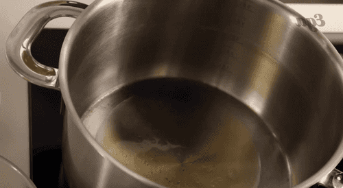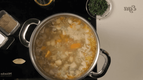 Pour 3 liters of water over the fried vegetables (a bit more is fine as some broth can be drained later for the sauce of the next dish), season with salt, bay leaf, and pepper, and cook for about fifteen minutes.
