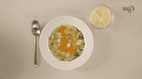 Pour the root vegetable soup into bowls and sprinkle with grated Parmesan.