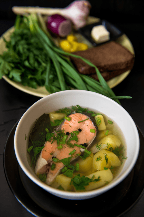 Cook for 20-30 minutes over medium heat. Then, take the fish out onto a separate plate and place it on the table, while pouring the resulting fish soup into bowls, adding herbs, specifically green onions and dill.