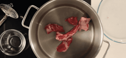 We clean the meat from the bones. Pour 2–2.5 liters of cold water into a pot, add the meat and bones, and place it on the fire.