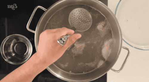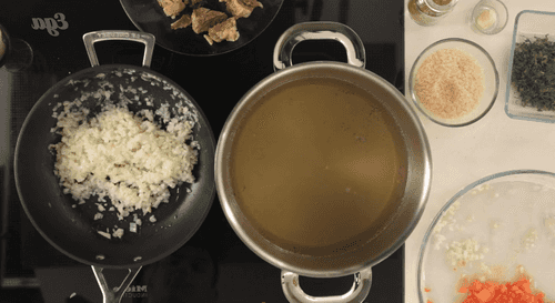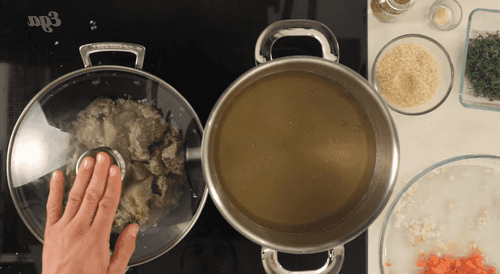 We send the contents of the pan to the broth, which is already on the stove and about to boil.