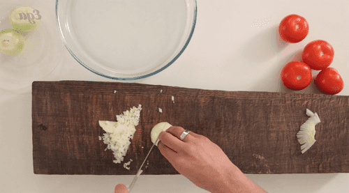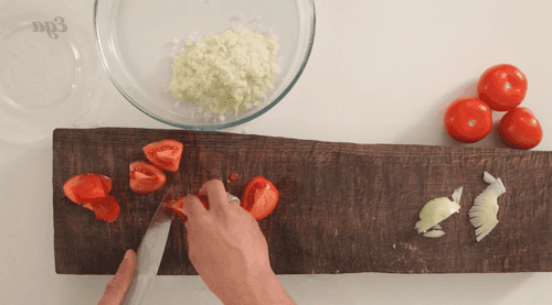 While the meat and onion are stewing, we prepare the tomatoes.