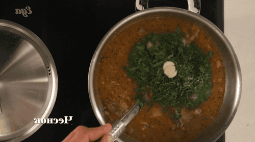 At the very last stage of preparation, we add crushed garlic and finely chopped herbs (dill, parsley, and cilantro).