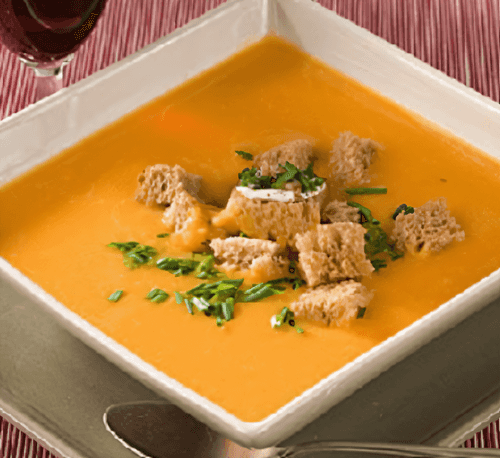 Pumpkin soup with curry and croutons is a harmony of tenderness and spiciness in one dish. Its roots trace back to European cuisine but draws inspiration from Eastern spices. The velvety texture of the soup, achieved by finely pureeing roasted pumpkin and potatoes, is complemented by the aroma of curry that adds a slight zest. Onions and garlic sautéed in olive oil create a rich flavor base. Crispy croutons with garlic notes complete the composition, adding textural contrast. This soup is perfect for cool days, warming you with its rich taste. Serving it with black sesame seeds gives the dish an elegant touch. It suits both a cozy family dinner and an elegant feast.