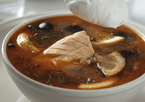 Fish solyanka with squid is a rich, aromatic dish of Russian cuisine that combines the wealth of seafood and the spicy notes of pickles. Its origin can be found in the traditions of Russian taverns, where solyanka was a symbol of abundance and hospitality. The taste of the dish is multifaceted: tender pink salmon and squid harmoniously complement sour-spicy cucumbers, olives, and capers. Tomato paste and parsley add richness, while lemon and sour cream provide a light freshness. Solyanka is perfect for a cozy family dinner or a festive feast, revealing the depth of Russian cuisine in one plate.