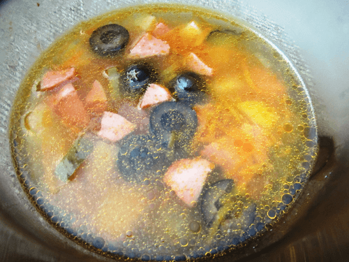 When the potatoes are soft, add tomato paste, a teaspoon of dried parsnip root, and a pinch of khmeli-suneli to the broth, along with meat slices and cucumbers with olives. Mix well and cook for about 15 minutes, skimming off the foam.