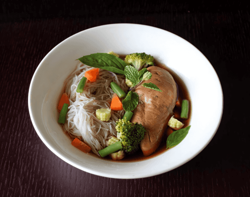Place one chicken fillet in each plate. Strain the broth and add it to the chicken. If desired, enhance the soup with rice, noodles, fresh herbs, and vegetables.
