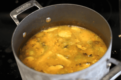 When the potatoes are almost ready, add sautéed vegetables and Brussels sprouts to the broth, boil for 5 minutes. Add salt.