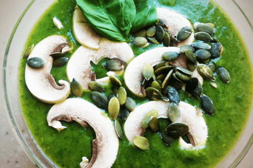 This refreshing cold soup-cocktail made from avocado, arugula, spinach, and basil is a true elixir of summer designed for those who appreciate lightness and harmony of flavors. Its roots trace back to modern American cuisine where the pursuit of healthy eating blends with a creative approach. The velvety texture of avocado perfectly complements the spicy notes of arugula and the rich freshness of spinach. Lemon juice and soy sauce add subtle acidity and umami accents, while mushroom carpaccio and crunchy pumpkin seeds complete the composition with an unexpected contrast of flavors. This soup is ideal for a light lunch or an exquisite appetizer for dinner, impressing not only with its taste but also with its elegant presentation. Cold and refreshing, it awakens the senses and gives a feeling of lightness like a summer breeze.