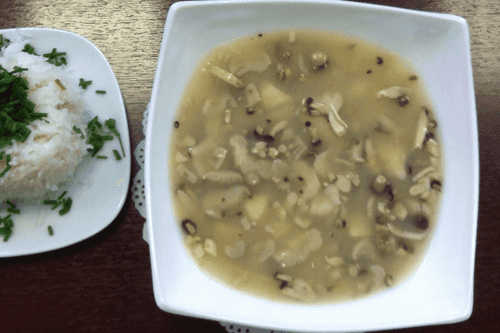 We squeeze lime juice into the ready soup; serve with finely chopped basil and boiled rice.