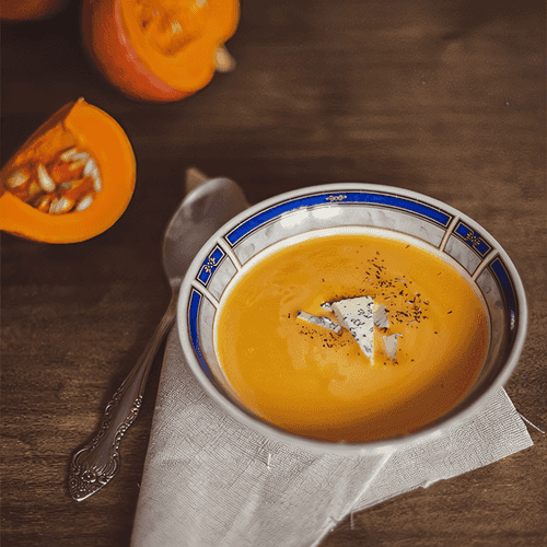 Pumpkin puree soup with Roquefort cheese is a refined dish of French cuisine that combines the tenderness of pumpkin with the spiciness of the famous blue cheese. This combination arose from the French culinary pursuit of flavor balance: the sweet pumpkin serves as an ideal base for the expressive notes of Roquefort. The velvety texture of the soup is achieved through cream, while butter adds richness. This soup is perfect for autumn dinners, warming with its soft yet deep flavor. Roquefort, with its characteristic salty and spicy note, adds sophistication and makes each spoonful truly memorable. The soup is served hot, accompanied by fresh baguette or crispy croutons, enhancing its gastronomic appeal.